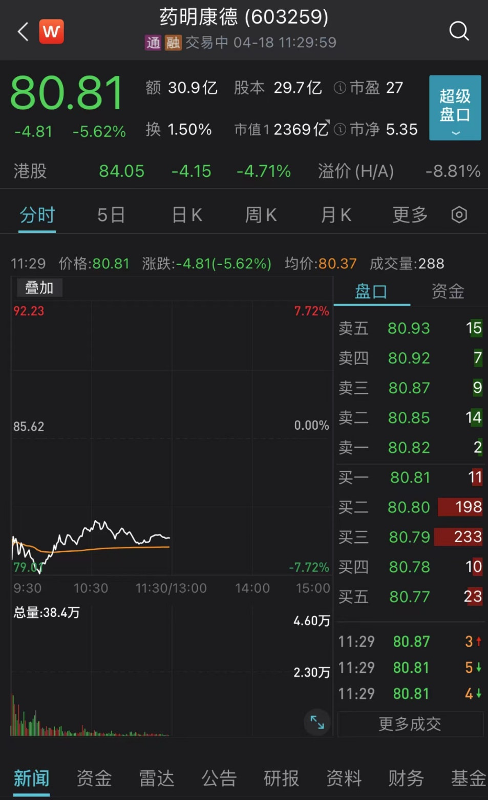 药明康德上午下跌5.62%,公司股东拟于2023年4月21日至2023年9月28日期间,减持公司股份不超过8902.27万股,减持比例不超过公司总股本的3.00%。