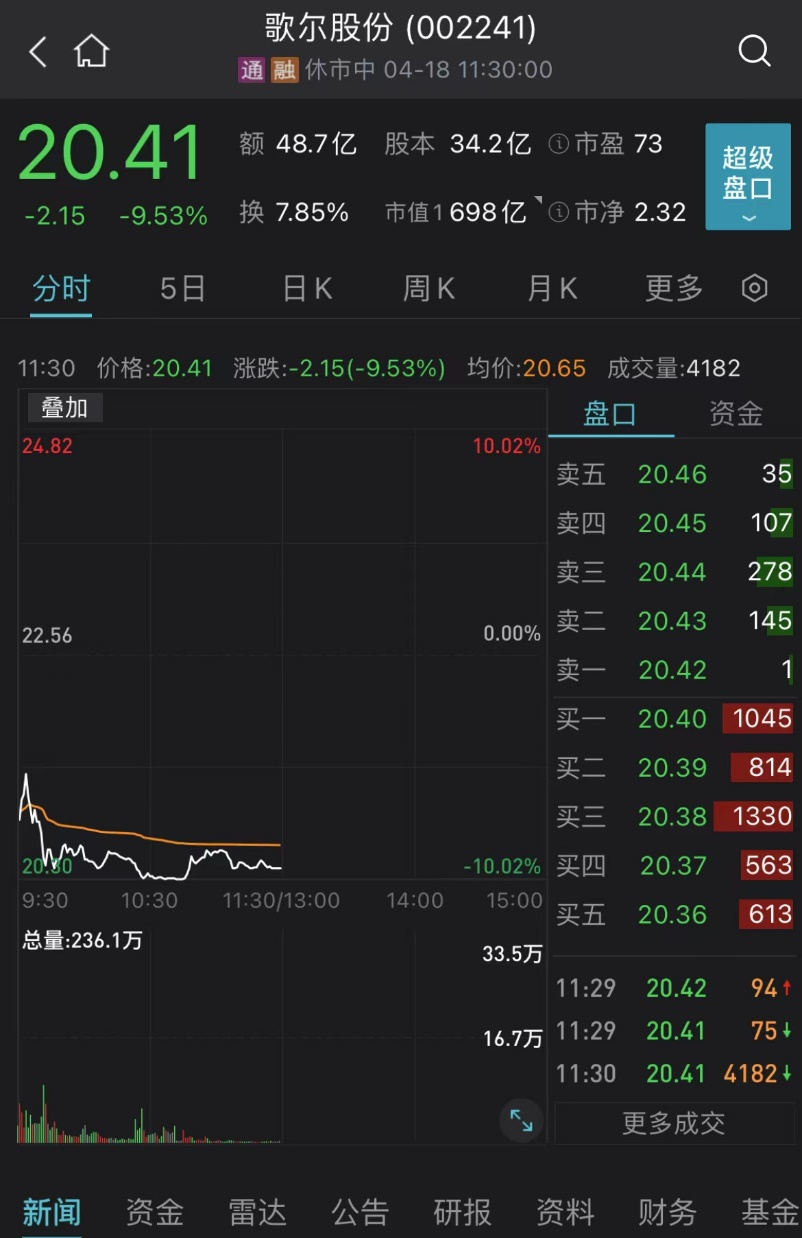 今天上午,歌尔股份(20.300, -2.26, -10.02%)下跌9.53%,盘中触及跌停。