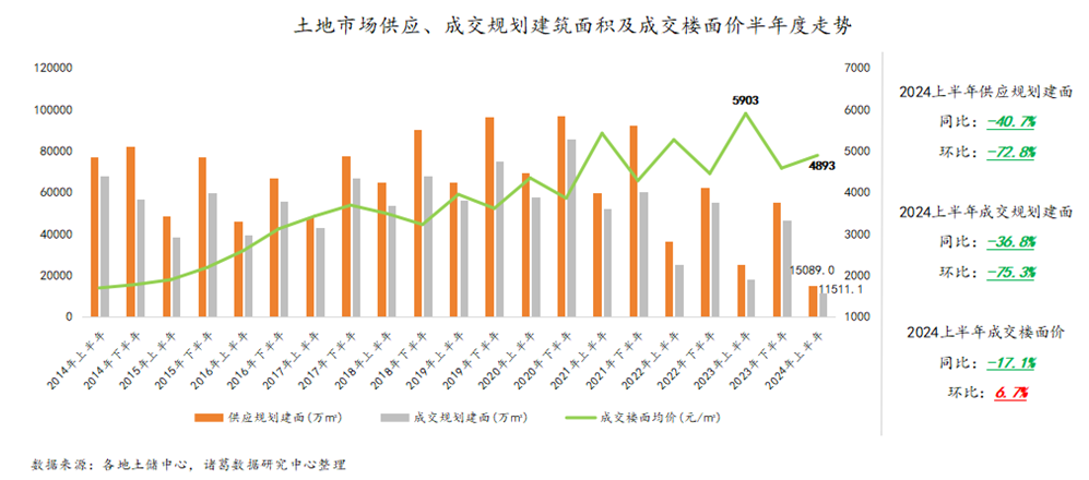 据诸葛数据研究中心监测数据,上半年土地供应规划建筑面积为15089万平方米,同比下跌40.7%;成交规划建筑面积11511.1万平方米,同比下跌36.8%;成交楼面价为4893元/平方米,同比下跌17.1%。