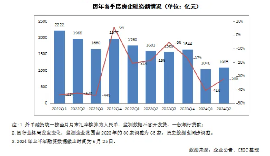 另据克而瑞数据,从历年65家典型房企的融资总量来看,2024年上半年融资总量为2131亿元,同比下降37%。从季度表现来看,一二季度分别同比下滑了41%及32%。